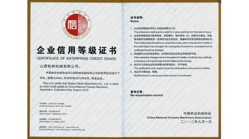 獲中國(guó)林業(yè)機(jī)械協(xié)會(huì)頒發(fā)的AAA級(jí)企業(yè)信用等級(jí)證書